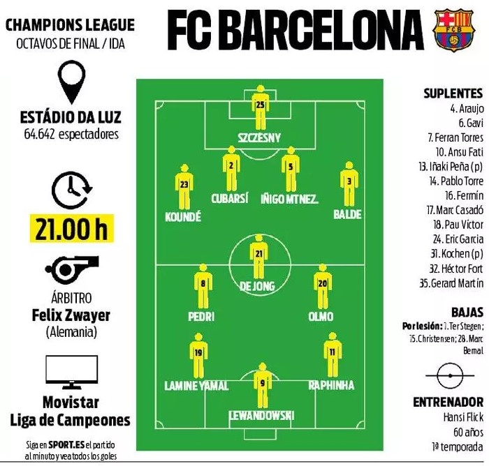 據(jù)每體分析,弗里克將在今晚排出一套本賽季從未使用過的首發(fā)組合:什琴斯尼坐鎮(zhèn)龍門;孔德、庫巴西、伊尼戈和巴爾德組成后防線;德容、佩德里和奧爾莫出任中場;亞馬爾、拉菲尼亞和萊萬搭檔三叉戟。