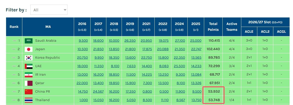 這也意味著中國(guó)參加26/27賽季的亞足聯(lián)賽事名額從2+1+1降為1+1+1(一支直通亞冠精英正賽+1個(gè)亞冠精英附加賽+1支直通亞冠二級(jí)聯(lián)賽正賽)。