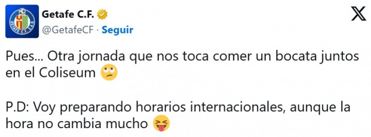 赫塔菲將于本周日下午14:00對(duì)陣馬競,而他們下個(gè)主場對(duì)陣萊加內(nèi)斯的比賽也是在下午14:00進(jìn)行。與此同時(shí),西甲聯(lián)賽宣布了第29輪的賽程,赫塔菲再次在下午14:00主場迎戰(zhàn)比利亞雷亞爾,俱樂部在社交網(wǎng)絡(luò)上調(diào)侃這一賽程。