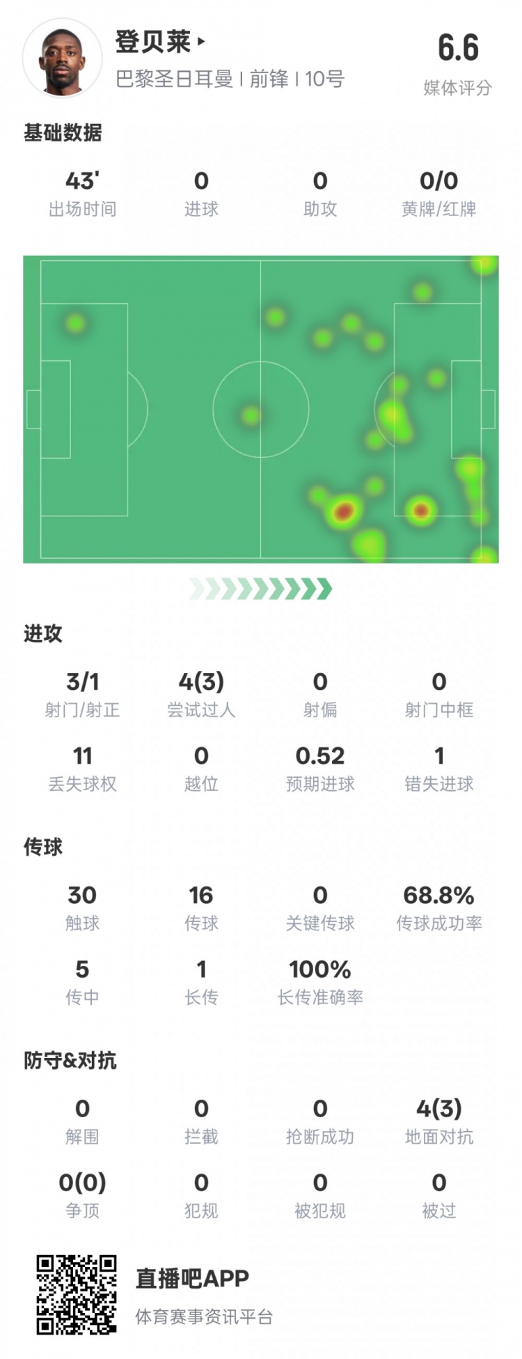 登貝萊半場數(shù)據(jù)如下: