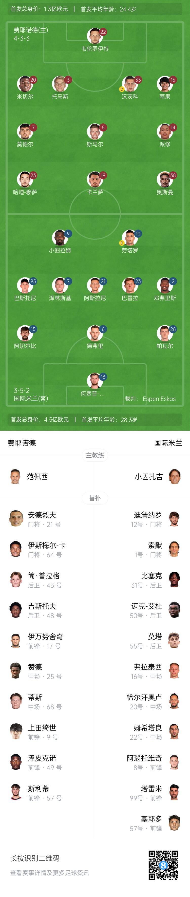3月6日訊 歐冠1/8決賽首回合,國(guó)米客場(chǎng)對(duì)陣費(fèi)耶諾德。賽前,官方公布了本場(chǎng)的首發(fā)名單。