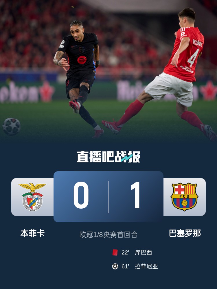 歐冠1/8決賽首回合,十人巴薩客場(chǎng)1-0本菲卡,庫(kù)巴西直紅,拉菲尼亞進(jìn)球。