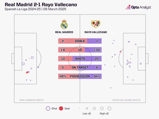 OPTA統(tǒng)計表明,本場比賽巴列卡諾有20次射門,而皇馬只有10次,這是除了面對巴薩之外,皇馬自2008年1月以來在西甲主場與對手最大的射門次數(shù)差。