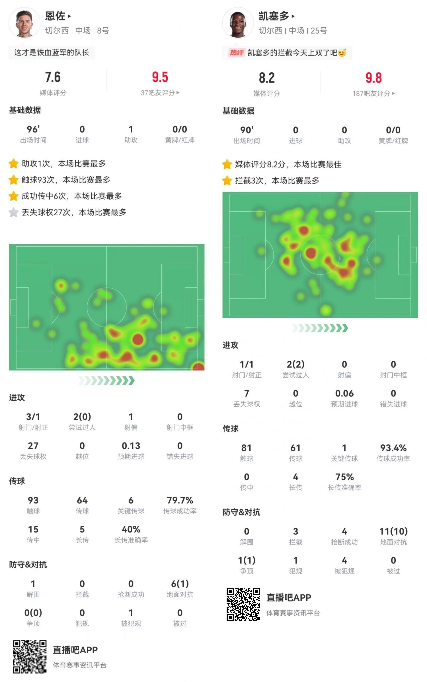 本場(chǎng)比賽恩佐與凱塞多的發(fā)揮可圈可點(diǎn)?!皣L試助攻王”恩佐總算“撿”到一個(gè)助攻,庫(kù)庫(kù)雷利亞的制勝球便是由恩佐傳導(dǎo)。凱塞多則繼續(xù)自己的戰(zhàn)神級(jí)發(fā)揮,本場(chǎng)比賽貢獻(xiàn)12次對(duì)抗11次成功,還有3攔截4搶斷0被過(guò)的鐵閘表現(xiàn)。切爾西的雙腰進(jìn)可攻退可守,正是藍(lán)軍本賽季戰(zhàn)績(jī)不錯(cuò)的原因之一。