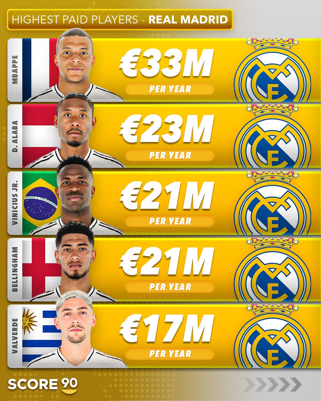 皇馬隊(duì)內(nèi)年薪前五:(單位/歐元)