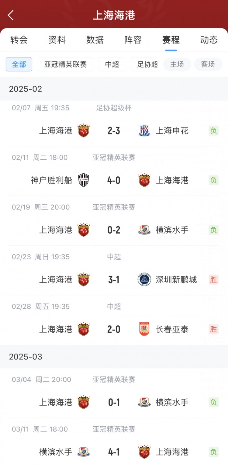 這7場比賽中,海港隊輸?shù)袅似渲?場,這造成球隊痛失超級杯冠軍,以及在亞冠精英聯(lián)賽止步于16強。不過在中超聯(lián)賽中,海港隊取得連勝,且2場聯(lián)賽僅失1球。