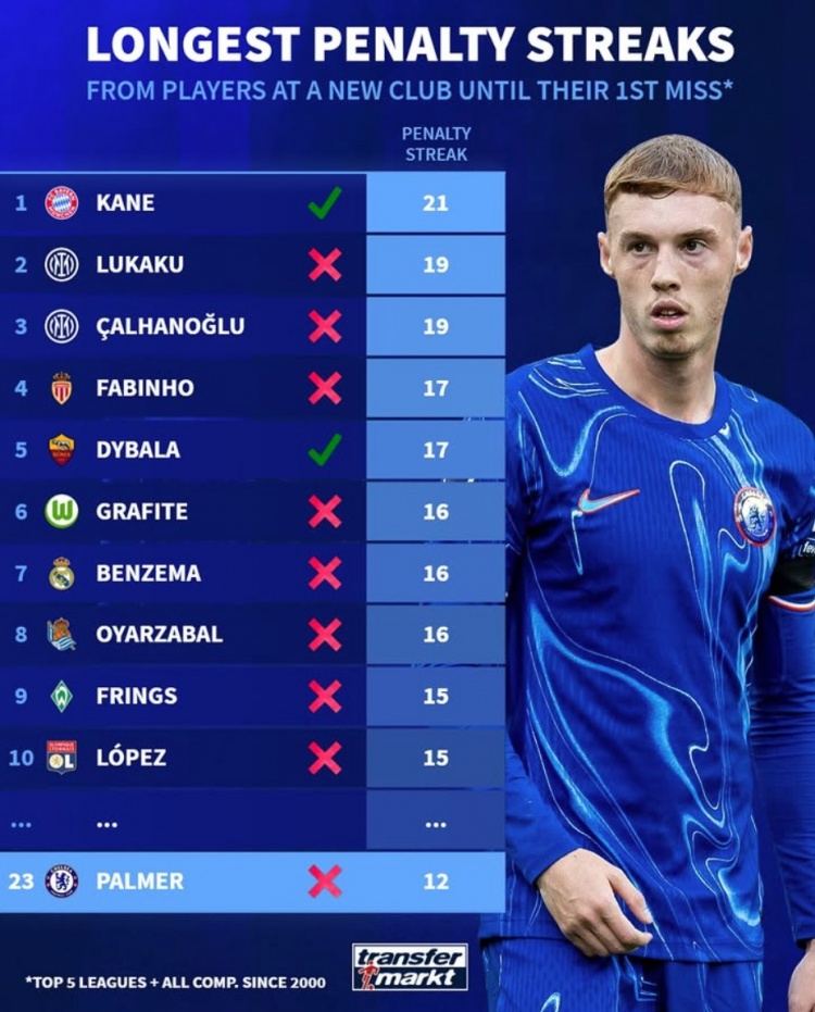 《轉(zhuǎn)會(huì)市場》統(tǒng)計(jì)了新世紀(jì)以來五大聯(lián)賽球員在新東家在不罰丟情況下連續(xù)命中點(diǎn)球紀(jì)錄,凱恩21球居首并且仍未罰丟。
