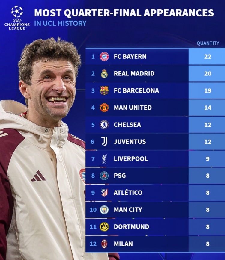 改制后歐冠共12支球隊(duì)至少8次晉級(jí)八強(qiáng):