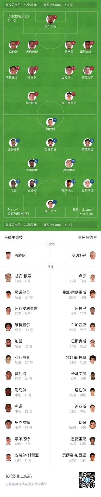皇馬首發(fā):1-庫爾圖瓦、23-門迪、22-呂迪格、35-阿森西奧、8-巴爾韋德、5-貝林厄姆、14-瓊阿梅尼、10-莫德里奇、7-維尼修斯、11-羅德里戈、9-姆巴佩