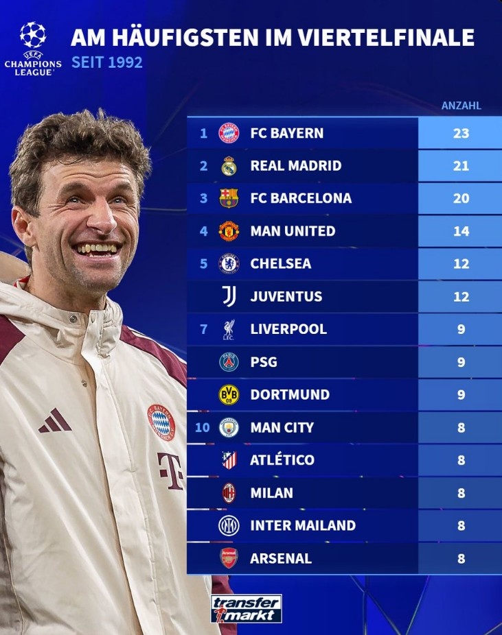 3月13日訊 本賽季歐冠8強產生,傳統(tǒng)豪門皇馬、巴薩、拜仁均在列,三支球隊也是歐冠改制后晉級8強次數最多的球隊,以下為具體次數榜: