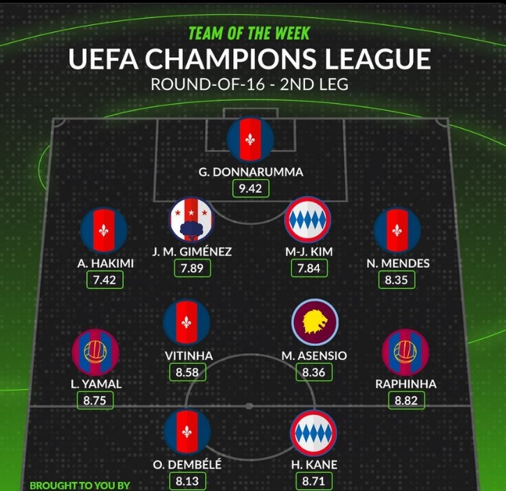 3月13日訊 歐冠16強(qiáng)戰(zhàn)次回合結(jié)束,數(shù)據(jù)網(wǎng)站W(wǎng)hoscored也盤(pán)點(diǎn)了本輪比賽最佳陣容,亞馬爾、凱恩、登貝萊等在列,具體如下: