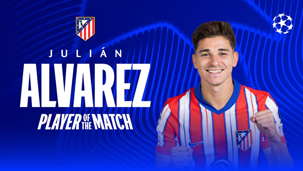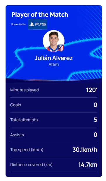 03月13日訊 歐冠1/8決賽次回合,皇家馬德里點(diǎn)球大戰(zhàn)戰(zhàn)勝馬競(jìng)晉級(jí)8強(qiáng),賽后,馬競(jìng)前鋒阿爾瓦雷斯當(dāng)選了全場(chǎng)最佳。