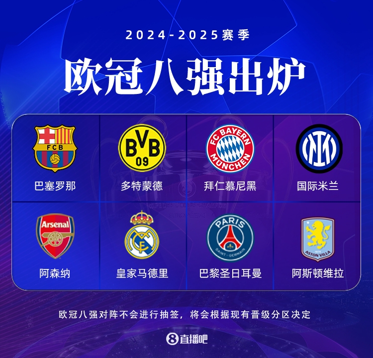3月13日訊 歐冠16強對陣結束,8強完整對陣出爐!詳細對陣如下,在前者先主后客。拜仁vs國米巴薩vs多特巴黎vs維拉阿森納vs皇馬 標簽: 歐冠 英超 阿森納 阿斯頓維拉 西甲 皇家馬德里 意甲 國際米蘭 德甲 拜仁慕尼黑 多特蒙德 法甲 巴黎圣日耳曼 足球