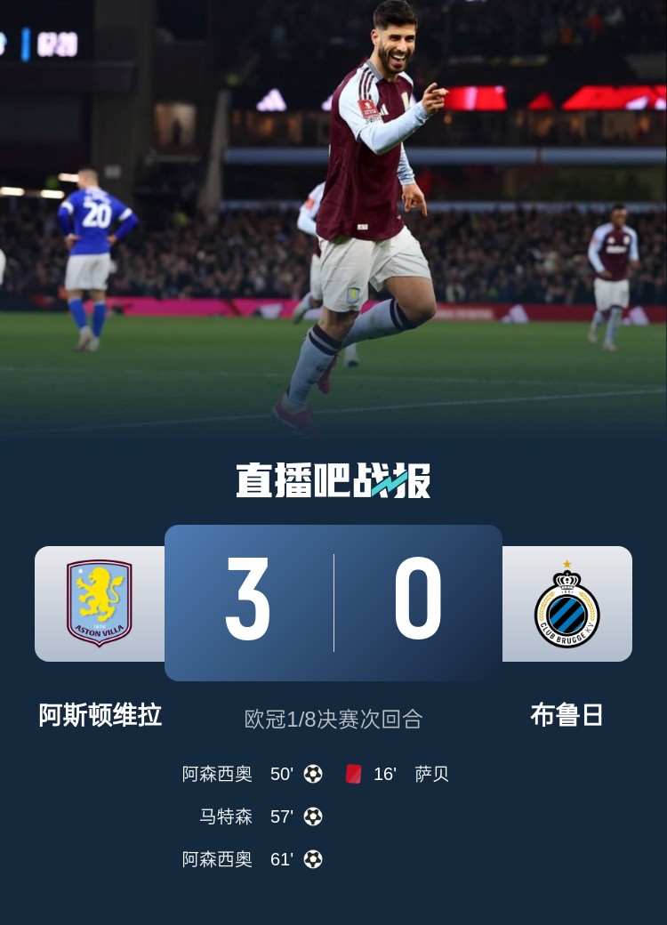 歐冠1/8決賽次回合,維拉3-0擊敗布魯日,總比分6-1晉級(jí)歐冠8強(qiáng)。上半場(chǎng),大馬丁精準(zhǔn)長傳找到拉什福德,后者制造直紅;下半場(chǎng),阿森西奧替補(bǔ)登場(chǎng)雙響,另有一次中柱,拉什福德貢獻(xiàn)1助攻,馬特森打進(jìn)1球。