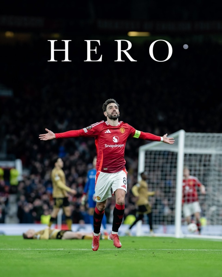曼聯(lián)官推也曬出B費(fèi)的慶祝海報,上面印有大大的“英雄”字樣。曼聯(lián)官推還配文:“無需多言。”