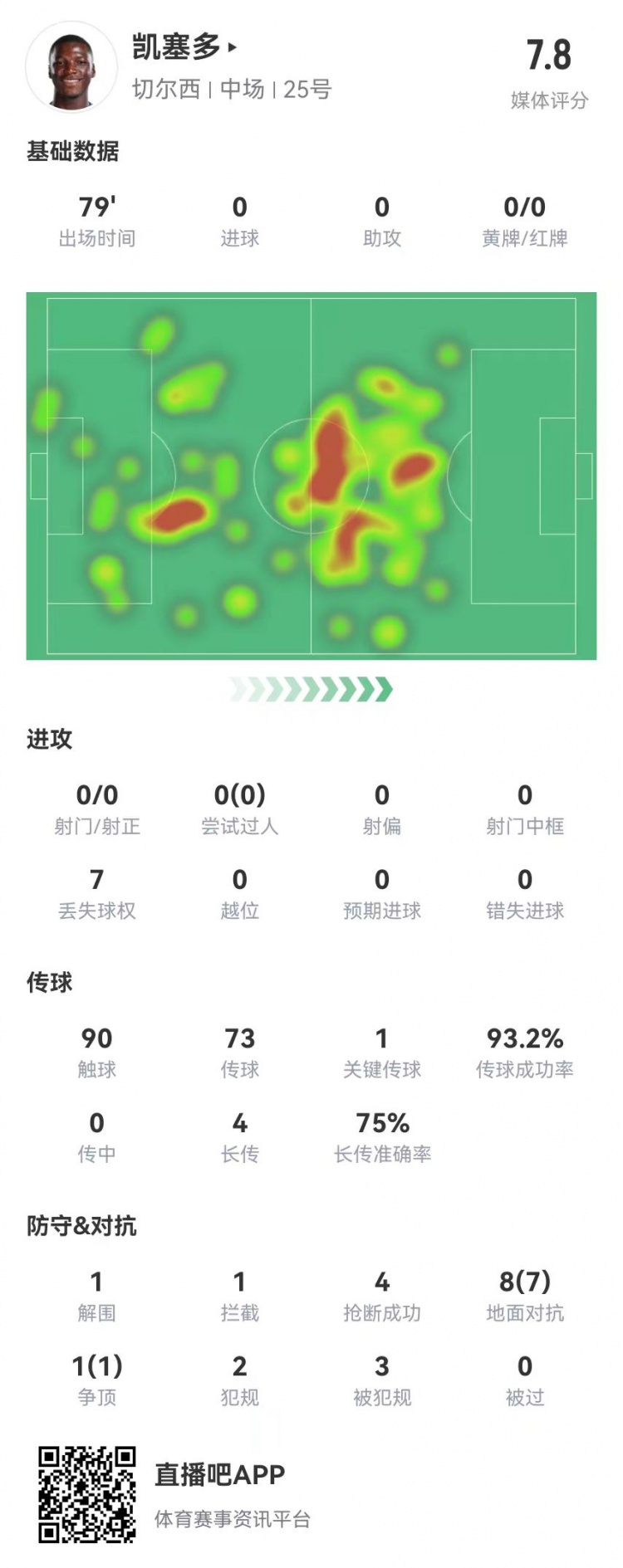 3月14日訊 切爾西在本輪歐協(xié)聯(lián)1-0領(lǐng)先哥本哈根,凱塞多本場(chǎng)數(shù)據(jù)如下: