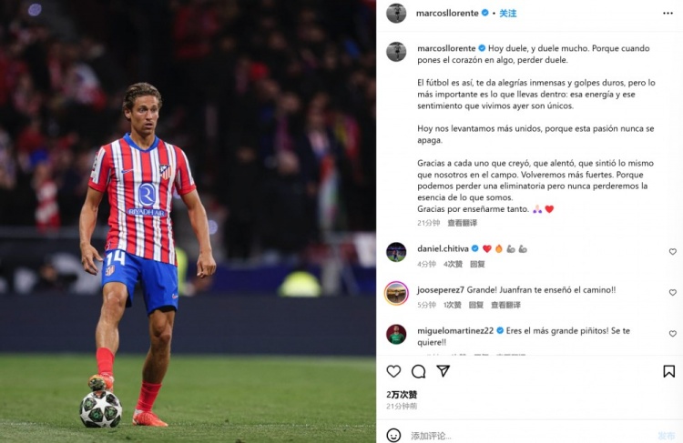 馬科斯-略倫特表示:“我今天很痛苦,而且是非常痛苦。因?yàn)楫?dāng)你全身心投入某項(xiàng)事業(yè)時(shí),失敗就是如此痛苦。足球就是這樣,它給你帶來(lái)巨大的快樂(lè)和沉重的打擊。但最重要的是你內(nèi)心所擁有的東西:我們昨天所感受到的動(dòng)力和經(jīng)歷是獨(dú)一無(wú)二的。”