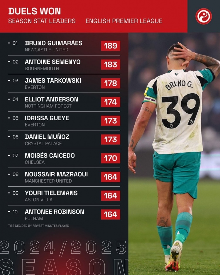 3月18日訊 國家隊(duì)比賽周到來,英超也暫時(shí)告一段落,squakwa統(tǒng)計(jì)了本賽季英超成功對抗情況,吉馬良斯居首。