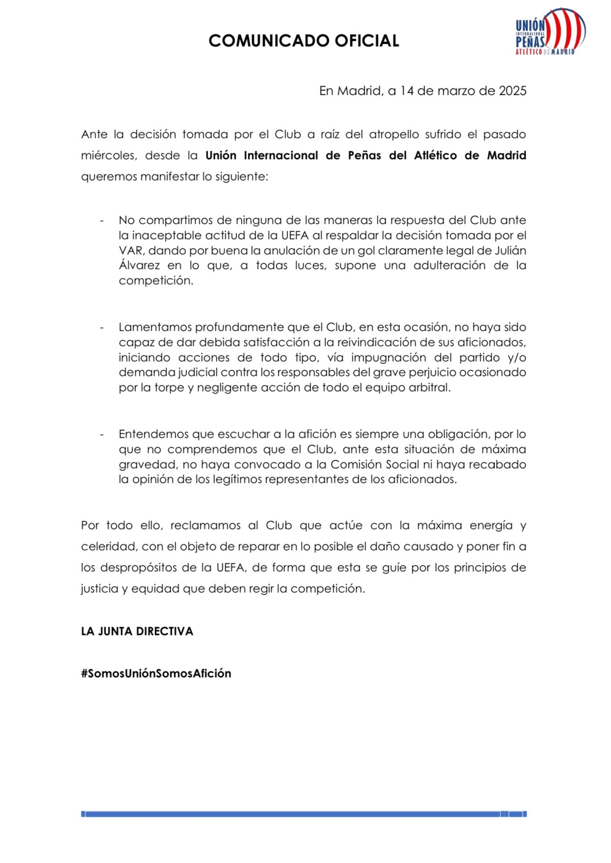 鑒于俱樂(lè)部因上周三發(fā)生的事件所做出的決定,馬德里競(jìng)技國(guó)際球迷會(huì)聯(lián)盟希望表達(dá)以下立場(chǎng):