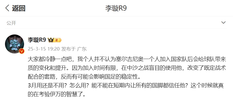 李璇寫道:大家都冷靜一點吧,我個人并不認為塞爾吉尼奧一個人加入國家隊后會給球隊帶來質(zhì)的變化和提升。因為加入時間有限,在中沙之戰(zhàn)盲目的使用他,改變了既定戰(zhàn)術(shù)配合的套路,反而有可能會影響國足的穩(wěn)定性。