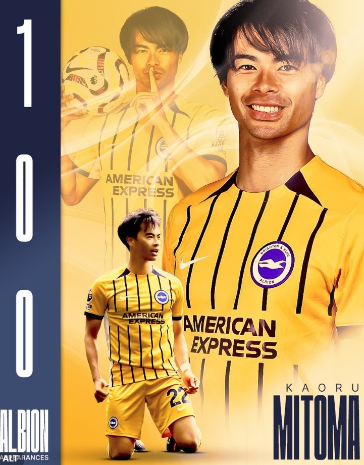 本場比賽三笘薫迎來代表布萊頓各項賽事第100次出戰(zhàn)里程碑,球隊官方也制作海報為其紀念這一特殊時刻。