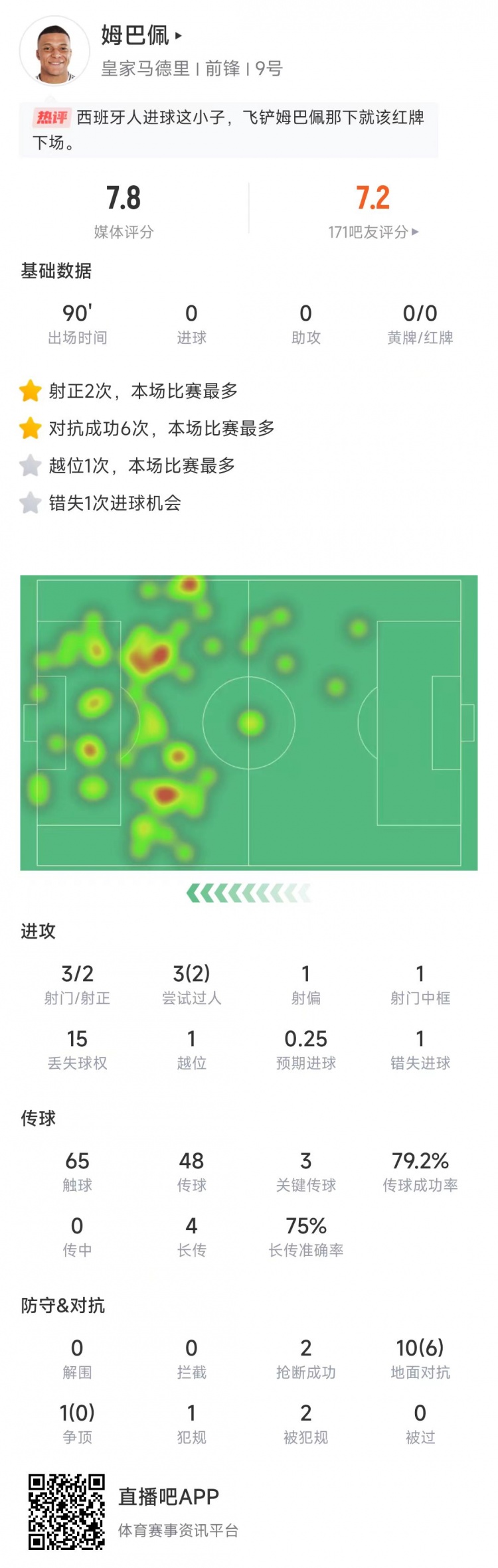 姆巴佩本場(chǎng)比賽數(shù)據(jù):