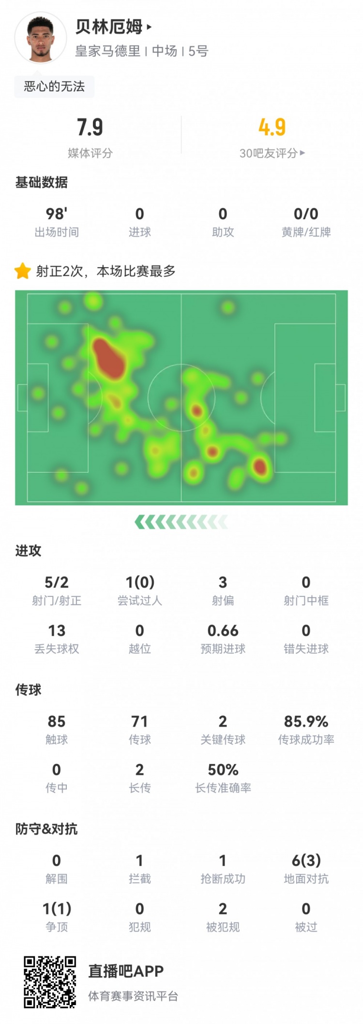 2月2日訊 本輪西甲,皇馬0-1客負(fù)西班牙人。此役貝林厄姆首發(fā)打滿全場,球員全場重點(diǎn)數(shù)據(jù)如下↓
