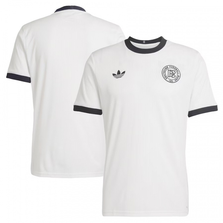 紀(jì)念球衣的設(shè)計(jì)以1974年復(fù)古球衣為藍(lán)本——這一年,德國男足國家隊(duì)在本土贏得了世界杯冠軍。125周年紀(jì)念球衣的配色和剪裁均承載著德國足協(xié)的歷史:球員版球衣采用經(jīng)典的黑白配色,而守門員球衣則為淡藍(lán)色。球衣采用細(xì)條紋面料,搭配袖口、圓領(lǐng)衣領(lǐng)以及衣領(lǐng)后方的旗幟印花。球衣胸前繡有阿迪達(dá)斯的三葉草標(biāo)志,以及特別為德國足協(xié)成立125周年設(shè)計(jì)的刺繡徽章,而該徽章的涉及靈感來自德國足協(xié)在萊比錫成立地所懸掛的紀(jì)念牌匾。
