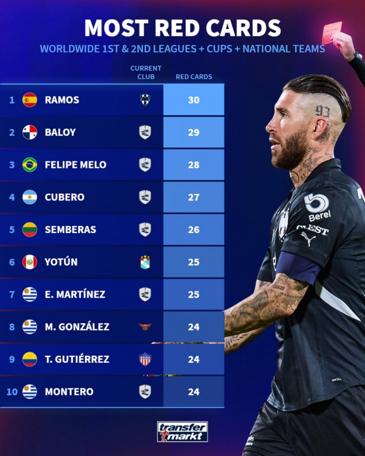 3月18日訊 墨西哥聯(lián)賽第12輪比賽,拉莫斯為蒙特雷首發(fā)出戰(zhàn),第92分鐘染紅離場(chǎng),最終蒙特雷客場(chǎng)3-1擊敗墨西哥美洲獅。德國(guó)轉(zhuǎn)會(huì)市場(chǎng)統(tǒng)計(jì)了球員吃到紅牌的數(shù)量,拉莫斯以30張紅牌居首。