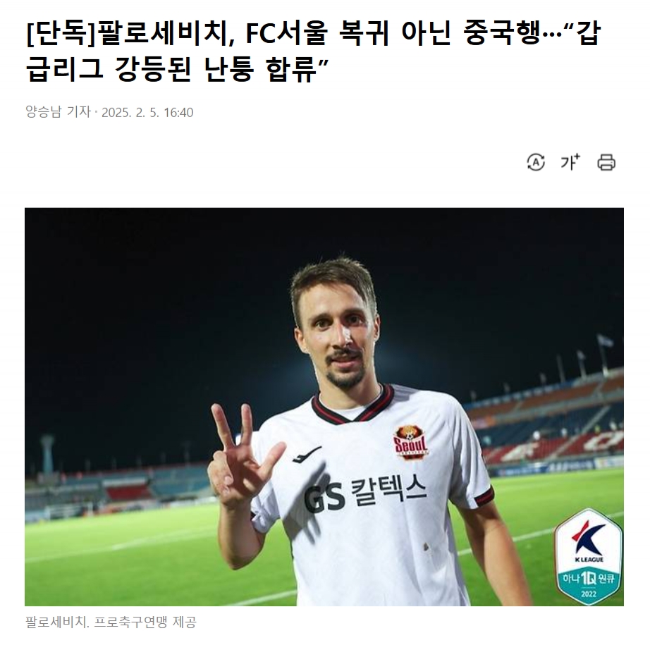 不過據(jù)韓媒“京鄉(xiāng)體育”報道,首爾FC俱樂部內(nèi)部人士在接受采訪時透露的確有中國球隊有意球員。這名人士表示:“的確有中國球隊對帕洛切維奇有意,但是截至目前正式轉(zhuǎn)會程序并未啟動,球隊將遵循球員意愿?!痹撁襟w透露,轉(zhuǎn)會有望很快就能完成。