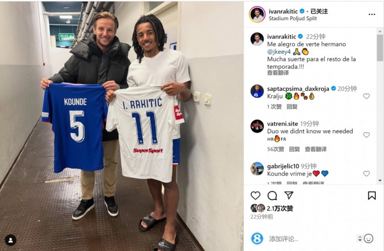 目前效力于哈伊杜克的拉基蒂奇社媒曬出與孔德互換球衣的照片,配文:“很高興見(jiàn)到你,我的兄弟孔德,祝你在本賽季余下的比賽中好運(yùn)!”