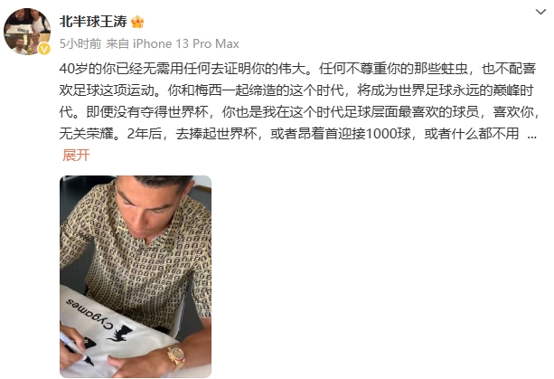 王濤寫道:“40歲的你已經無需用任何去證明你的偉大。任何不尊重你的那些蛀蟲,也不配喜歡足球這項運動。你和梅西一起締造的這個時代,將成為世界足球永遠的巔峰時代。即便沒有奪得世界杯,你也是我在這個時代足球層面最喜歡的球員,喜歡你,無關榮耀。2年后,去捧起世界杯,或者昂著首迎接1000球,或者什么都不用爭取,因為你足夠偉大了。祝你生日快樂!”