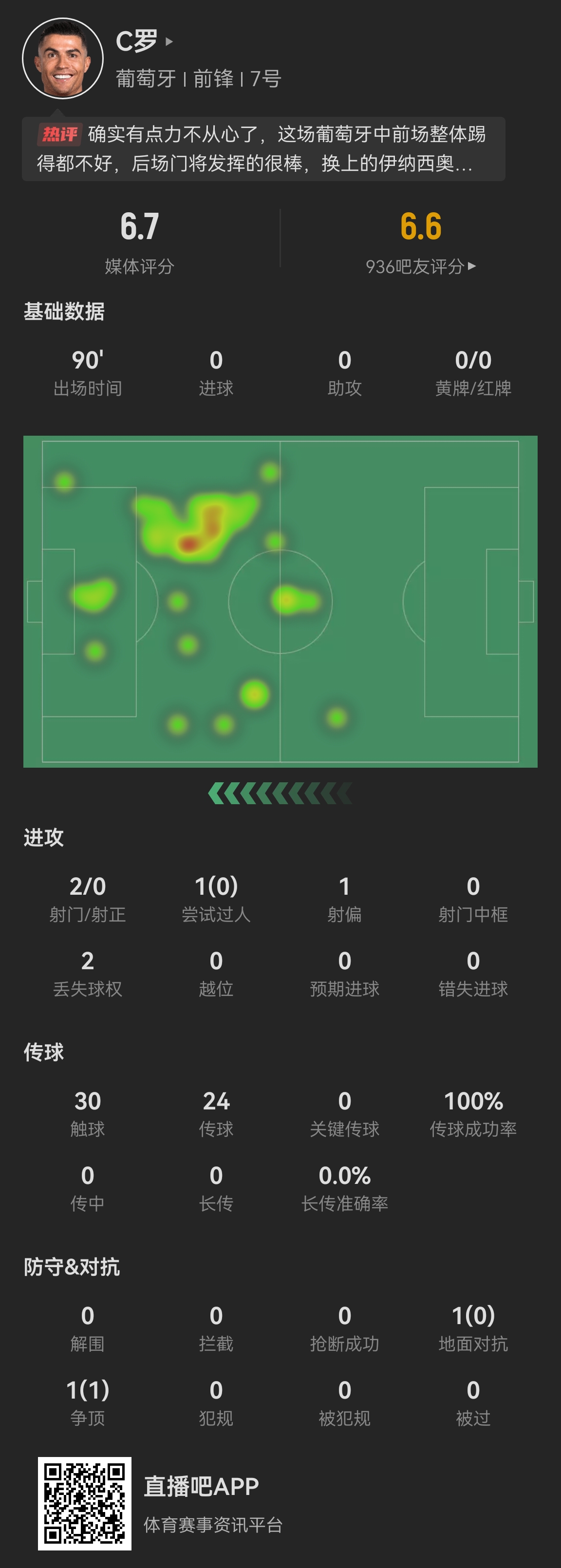 40歲的C羅首發(fā)出場(chǎng),打滿了全場(chǎng),觸球30次,獲評(píng)6.7分,這兩項(xiàng)數(shù)據(jù)均為葡萄牙首發(fā)球員最低。