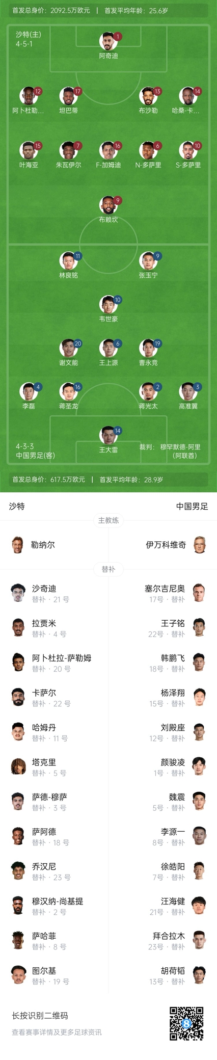 3月21日訊 世預(yù)賽亞洲區(qū)第三階段C組第7輪,中國男足客場挑戰(zhàn)沙特,賽前首發(fā)名單公布。