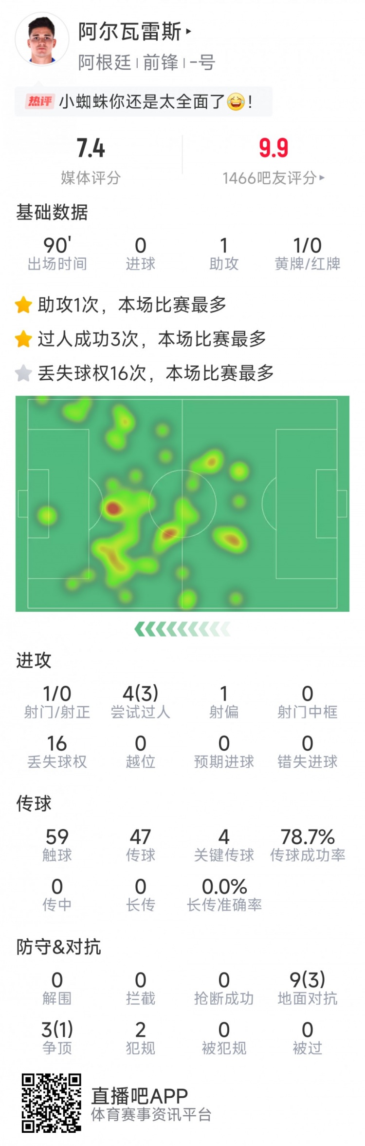 3月22日訊 在本輪南美區(qū)世預賽,阿根廷1-0擊敗烏拉圭,阿爾瓦雷斯首發(fā)出戰(zhàn)表現出色,以下為他在本場數據: