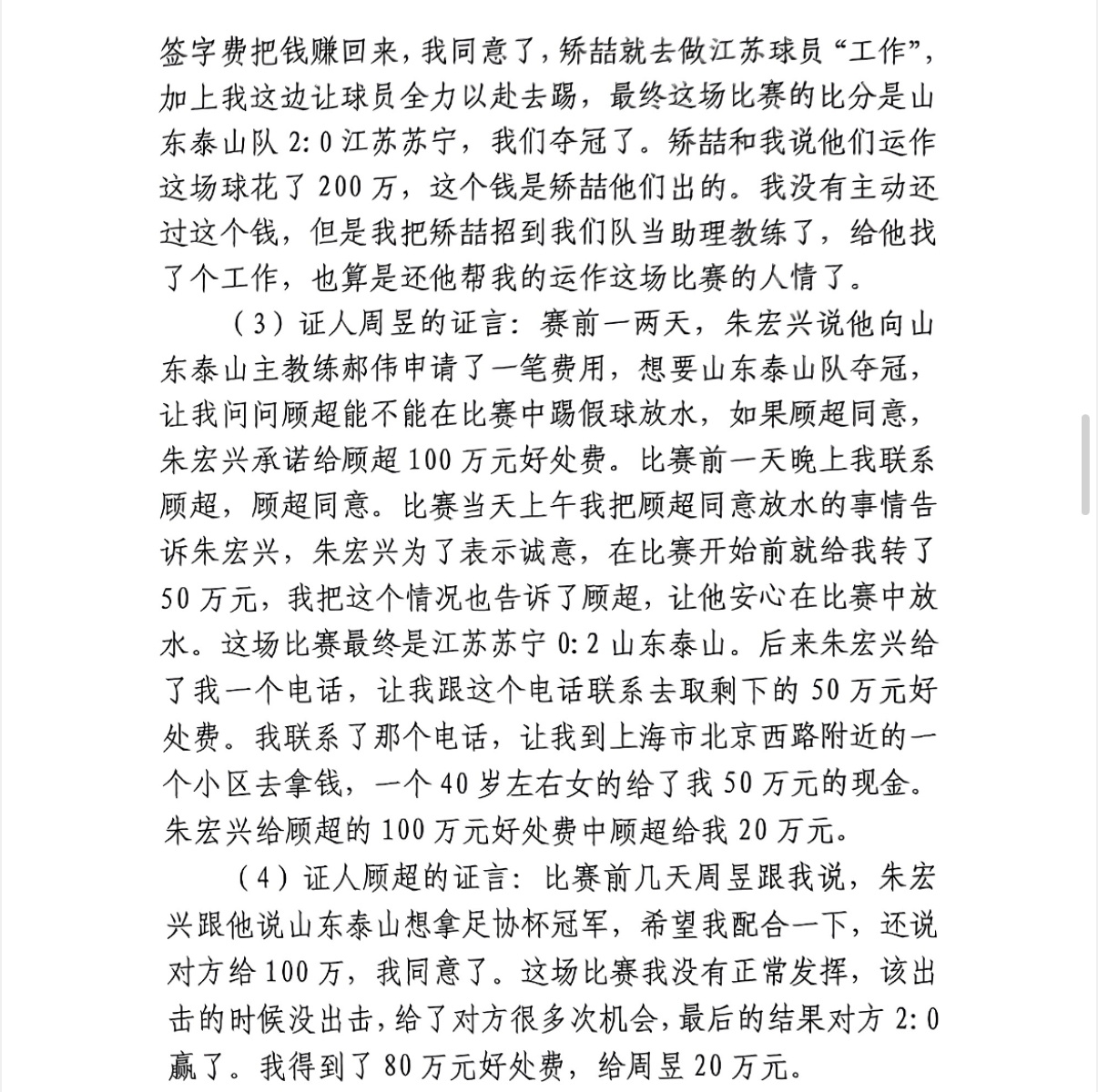 周昱的證言:賽前一兩天,朱宏興說他向山東泰山主教練郝偉申請了一筆費用,想要山東泰山隊奪冠,讓我問問顧超能不能在比賽中踢假球放水,如果顧超同意,朱宏興承諾給顧超100萬元好處費。比賽前一天晚上我聯(lián)系顧超,顧超同意。比賽當天上午我把顧超同意放水的事情告訴朱宏興,朱宏興為了表示誠意,在比賽開始前就給我轉(zhuǎn)了50萬元,我把這個情況也告訴了顧超,讓他安心在比賽中放水。這場比賽最終是江蘇蘇寧0:2山東泰山。后來朱宏興給了我一個電話,讓我跟這個電話聯(lián)系去取剩下的50萬元好處費。我聯(lián)系了那個電話,讓我到上海市北京西路附近的一個小區(qū)去拿錢,一個40歲左右女的給了我50萬元的現(xiàn)金。朱宏興給顧超的100萬元好處費中顧超給我20萬元。