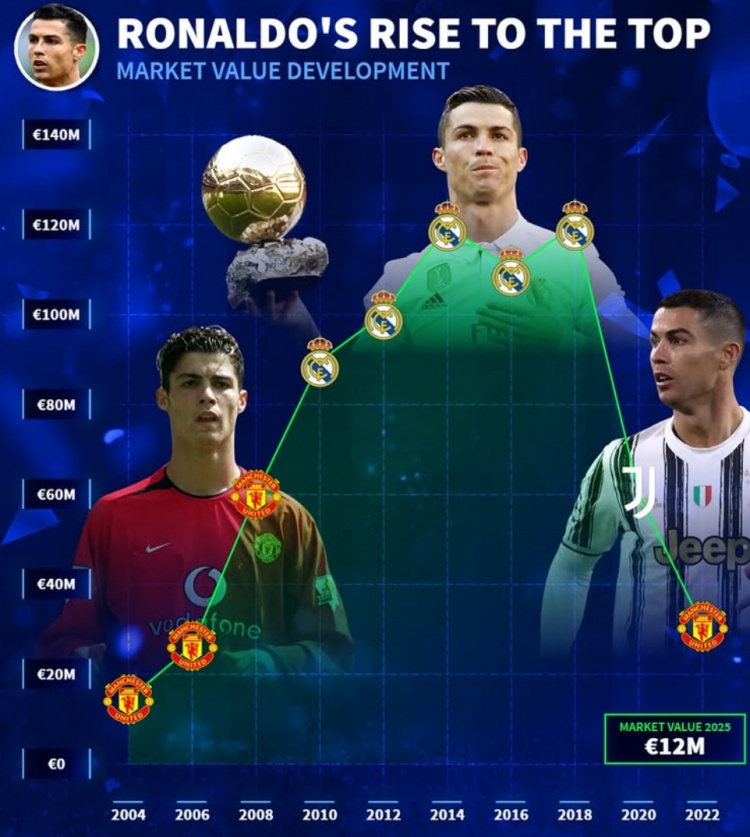 2月6日訊 C羅在今日迎來(lái)40歲生日,《轉(zhuǎn)會(huì)市場(chǎng)》也列出了他生涯身價(jià)變化軌跡圖。