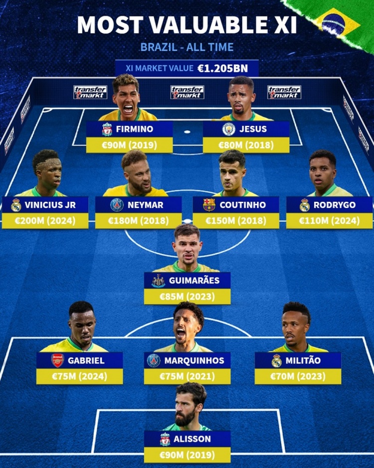 3月26日訊 北京時間今天上午8點,巴西將在世預賽中客場對陣阿根廷。德國轉會市場列出了巴西歷史德轉身價最高陣容,內馬爾、維尼修斯、庫蒂尼奧在列,總價12.05億歐。
