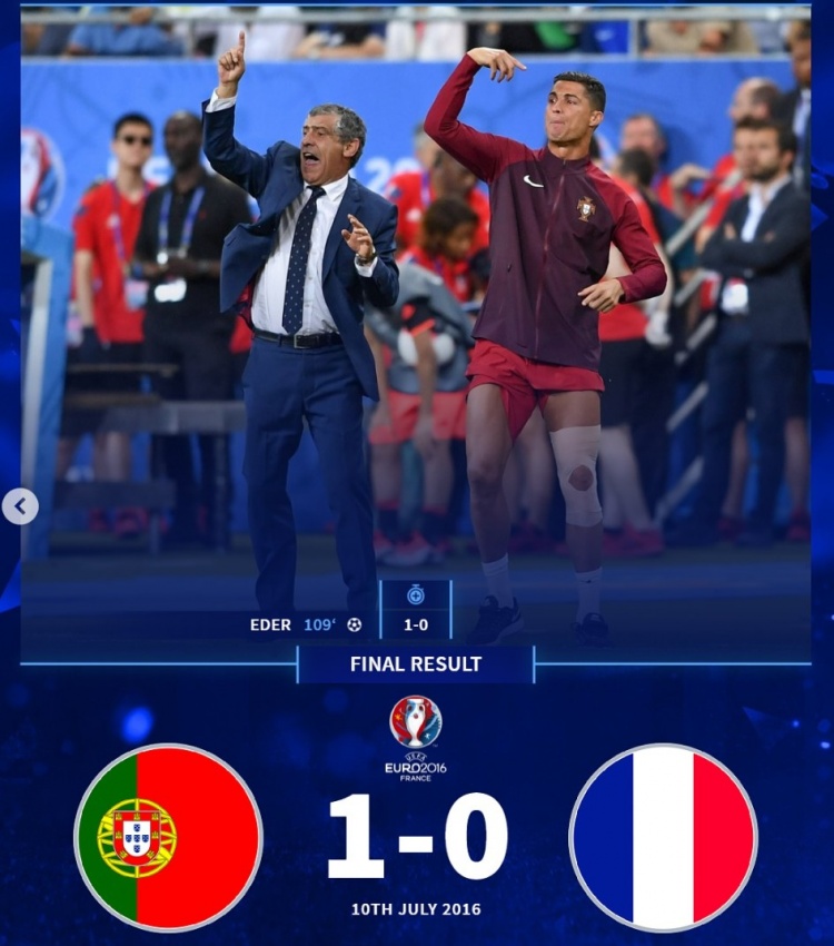2016年歐洲杯決賽葡萄牙1-0法國:幾乎一己之力扛著葡萄牙闖進決賽的C羅傷退,他在場邊指揮比賽的場面也成為經典,最終替補神兵埃德一劍封喉,幫助葡萄牙奪得隊史歐洲杯首冠。