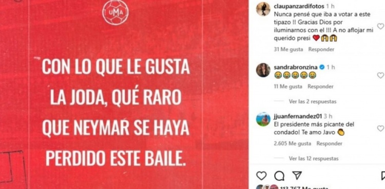 在INS上,米萊嘲諷了本場(chǎng)比賽缺陣的內(nèi)馬爾,他寫道:內(nèi)馬爾是如此熱愛聚會(huì),他這次缺席讓人感到奇怪。