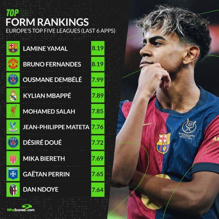 3月28日訊 國家隊比賽周已經(jīng)結(jié)束,whoscored統(tǒng)計了五大聯(lián)賽此前6輪的場均評分情況,亞馬爾和B費(fèi)并列居首。