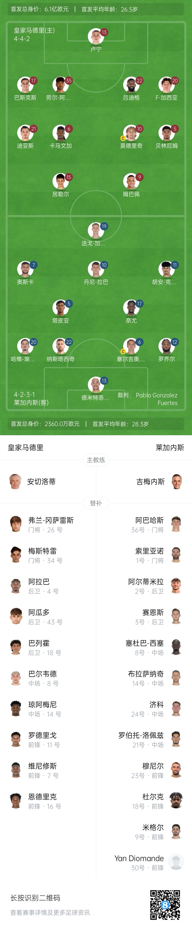 皇馬替補:26-弗蘭-岡薩雷斯、34-梅斯特雷、4-阿拉巴、7-維尼修斯、8-巴爾韋德、11-羅德里戈、14-瓊阿梅尼、16-恩德里克、18-巴列霍、43-迭戈-阿瓜多