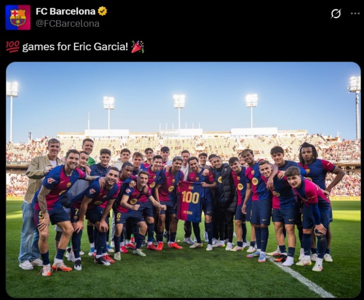 本場(chǎng)比賽埃里克-加西亞首發(fā)登場(chǎng),這是他加盟巴薩以來(lái)各項(xiàng)賽事第100次出場(chǎng),賽后他也獲贈(zèng)球隊(duì)100號(hào)定制球衣,并與全隊(duì)球員合影留念。