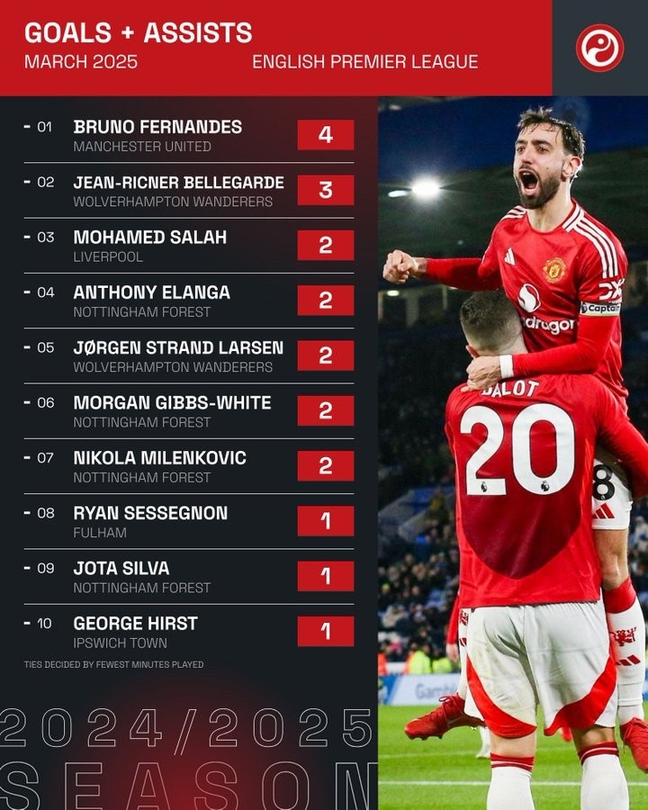 4月1日 據Squawka統(tǒng)計,B費參與了曼聯在三月份英超聯賽中所有的4個進球,這在英超球員中排在第一位。