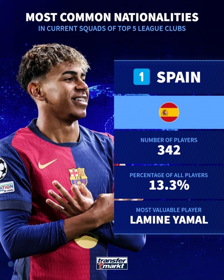 4月1日訊 德國轉(zhuǎn)會市場統(tǒng)計了五大聯(lián)賽各國球員的數(shù)量,并列出榜單,西班牙342人最多,法國292人次席。