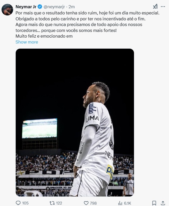 2月6日訊 圣保羅州聯(lián)賽,桑托斯1-1博塔弗戈SP。本場比賽,內(nèi)馬爾替補出場,上演了回歸桑托斯的首秀,賽后內(nèi)馬爾更新了社媒。