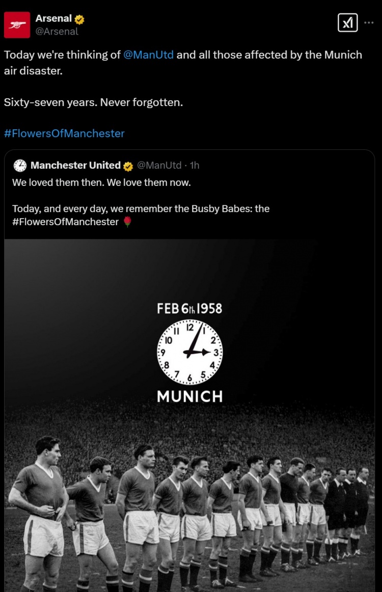阿森納寫道:今天,我們向曼聯(lián)和所有受到慕尼黑空難影響的人們致以哀思。六十七年過(guò)去了,我們永遠(yuǎn)不會(huì)忘記。