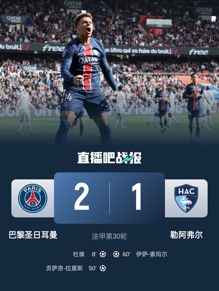 法甲第30輪,巴黎圣日耳曼2-1勒阿弗爾,杜埃、拉莫斯進(jìn)球。
