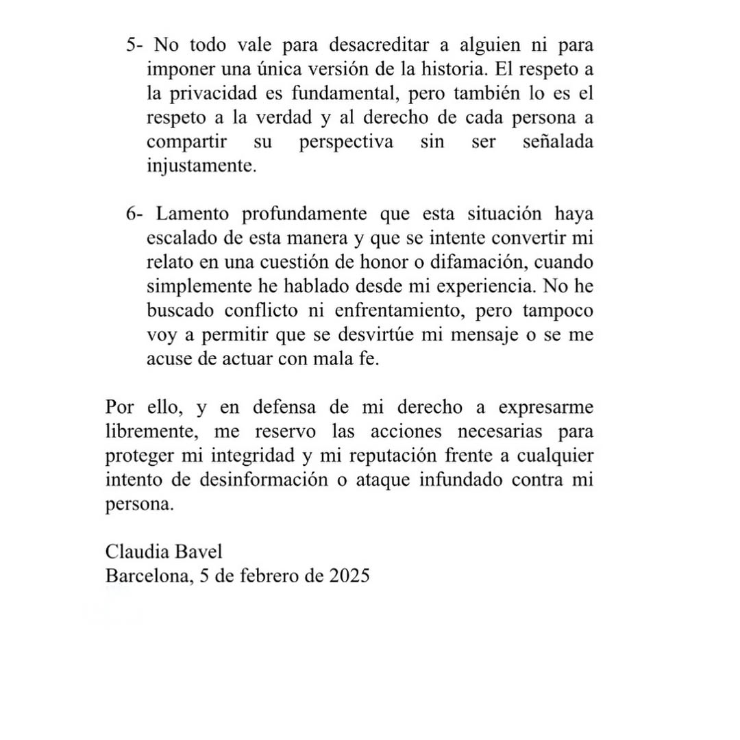 克勞迪婭-巴維爾隨后也給出了自己的回應(yīng),她表示:“鑒于最近的事件和公開(kāi)聲明,我覺(jué)得有必要表達(dá)以下觀點(diǎn)。和任何人一樣,我有權(quán)分享我的經(jīng)歷,而不意味著侵犯他人的隱私。我一直對(duì)我的社區(qū)和關(guān)注我的人保持透明,從未試圖用我的言辭傷害任何人。”