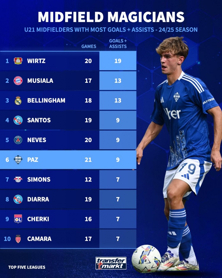 2月7日訊 德國轉(zhuǎn)會(huì)市場統(tǒng)計(jì)了本賽季五大聯(lián)賽U21中場參與進(jìn)球的數(shù)量,并列出榜單,維爾茨參與19球居首,尼科-帕斯參與9球排名并列第4位。